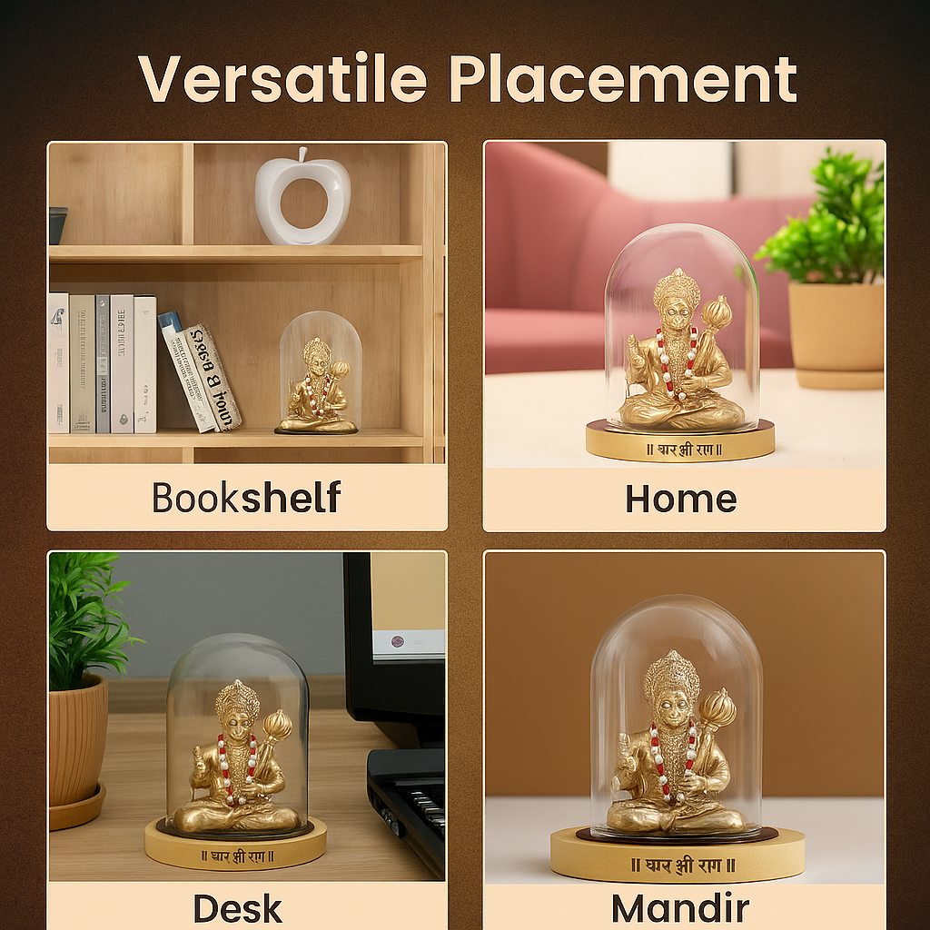 Bring home the fearless energy of Lord Hanuman with this finely 3D-printed resin idol, encased in a sleek borosilicate glass dome. Perfect for your car, work desk, or pooja space, it radiates strength and divine protection.